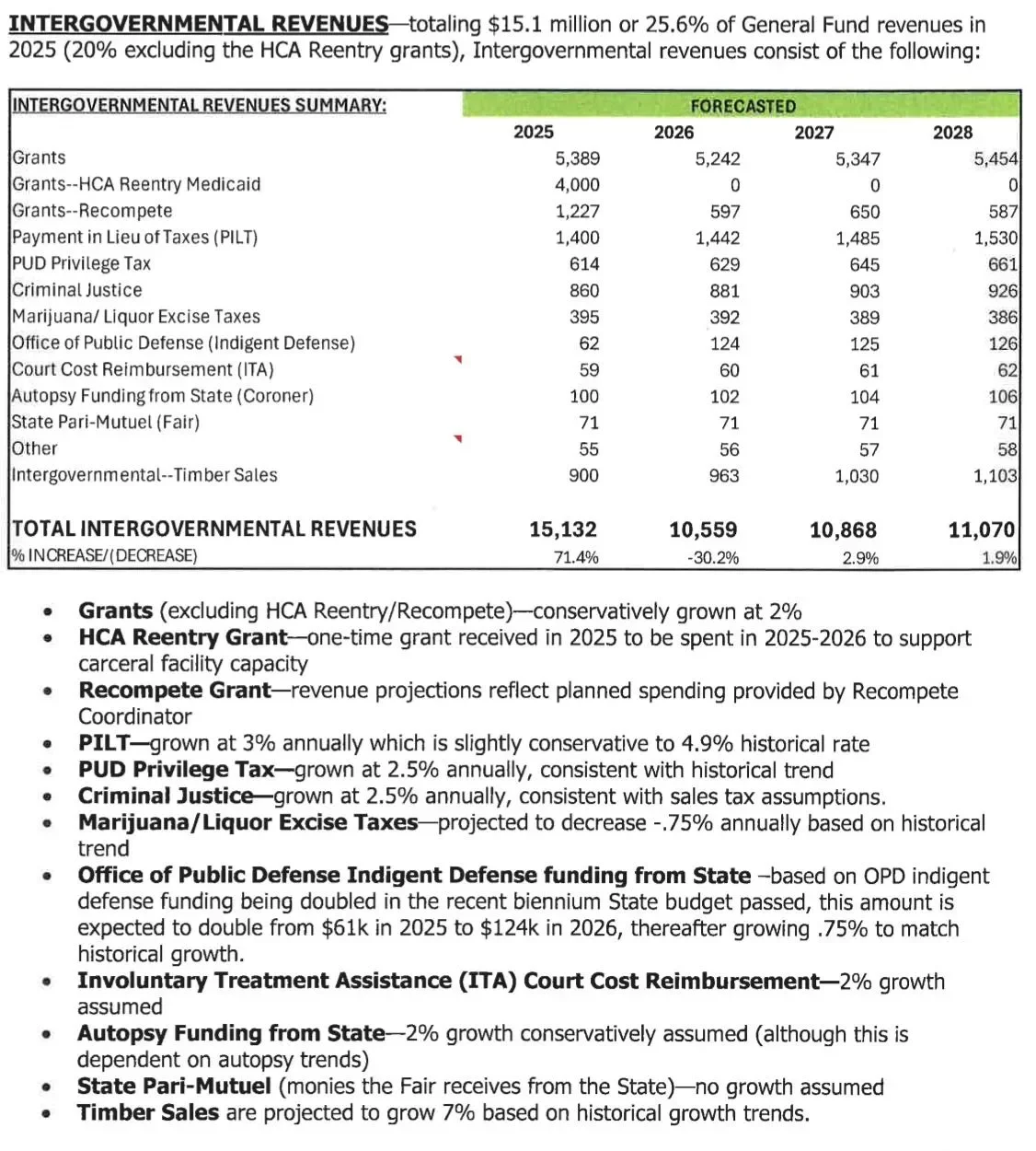 NOTE: expense increases are calculated from 2025 through 2028. Payroll/benefits accounts for “underspend”. More details on “underspend”, Intergovernmental Revenues, and Payroll are displayed below.