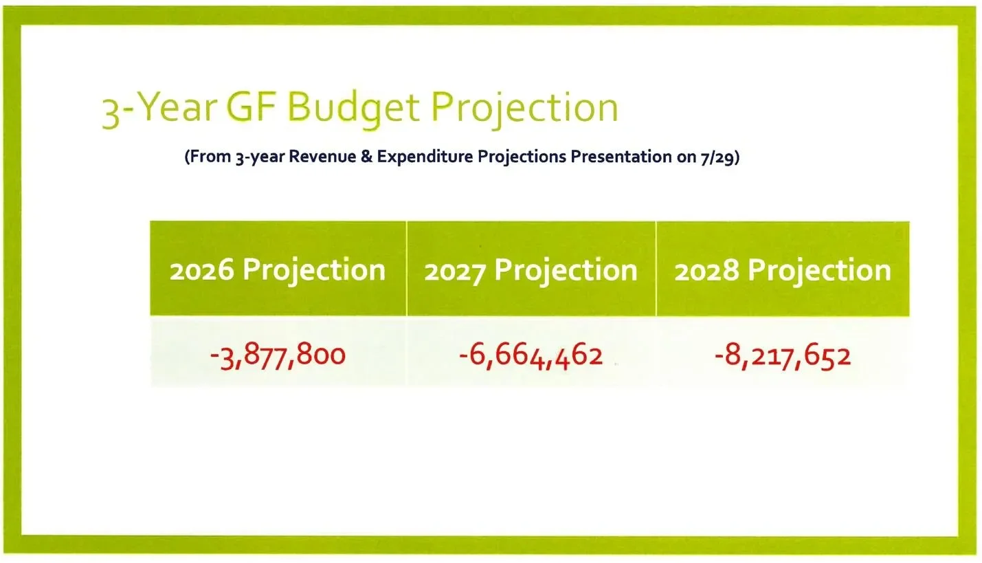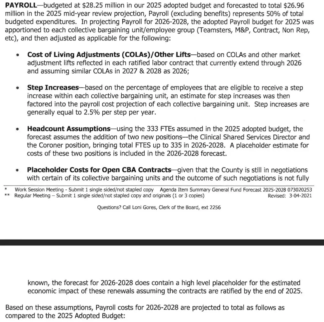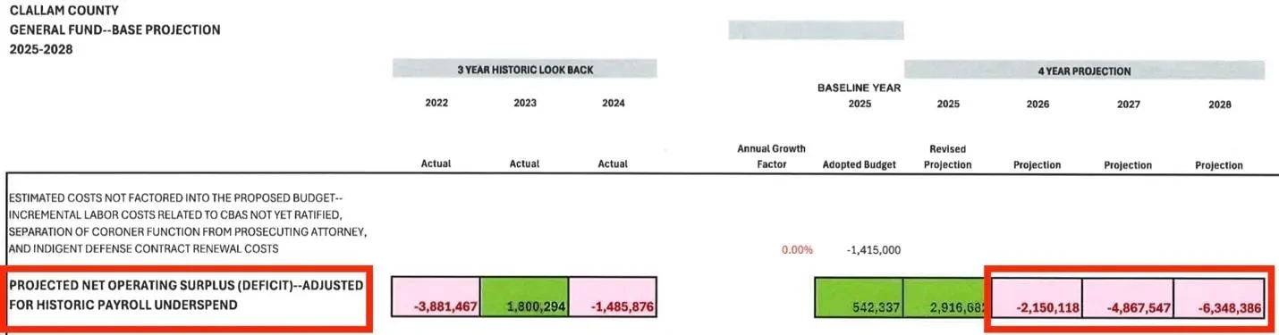 $1.8M in “underspend” — the county crafts its budget as if every department is fully staffed all year, which never happens. Adjusting for this alone drops the 2028 deficit to $6.3M.
