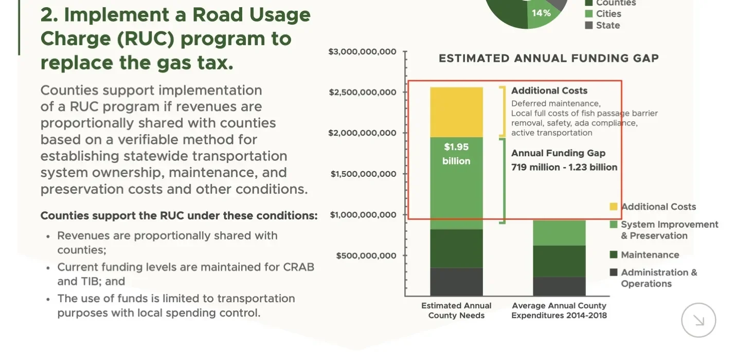 The “Annual Funding Gap” makes it clear that the proposed Road Usage Tax is designed to increase overall transportation tax collections, not simply replace declining gas-tax revenue as EV use grows.