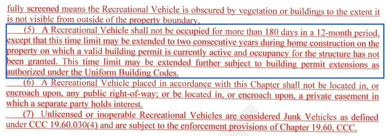 The most controversial? A 180-day limit on RV occupancy on private property.