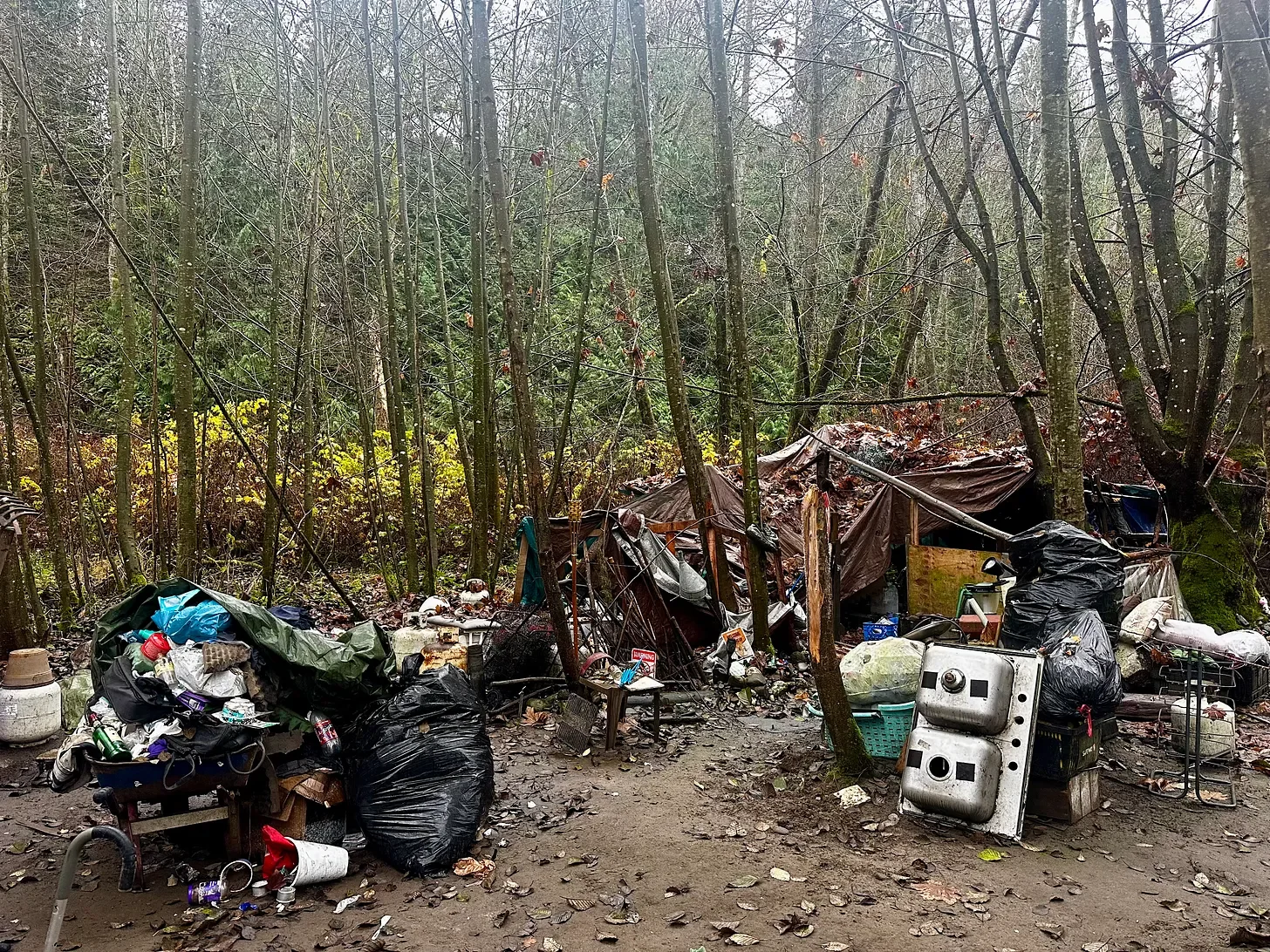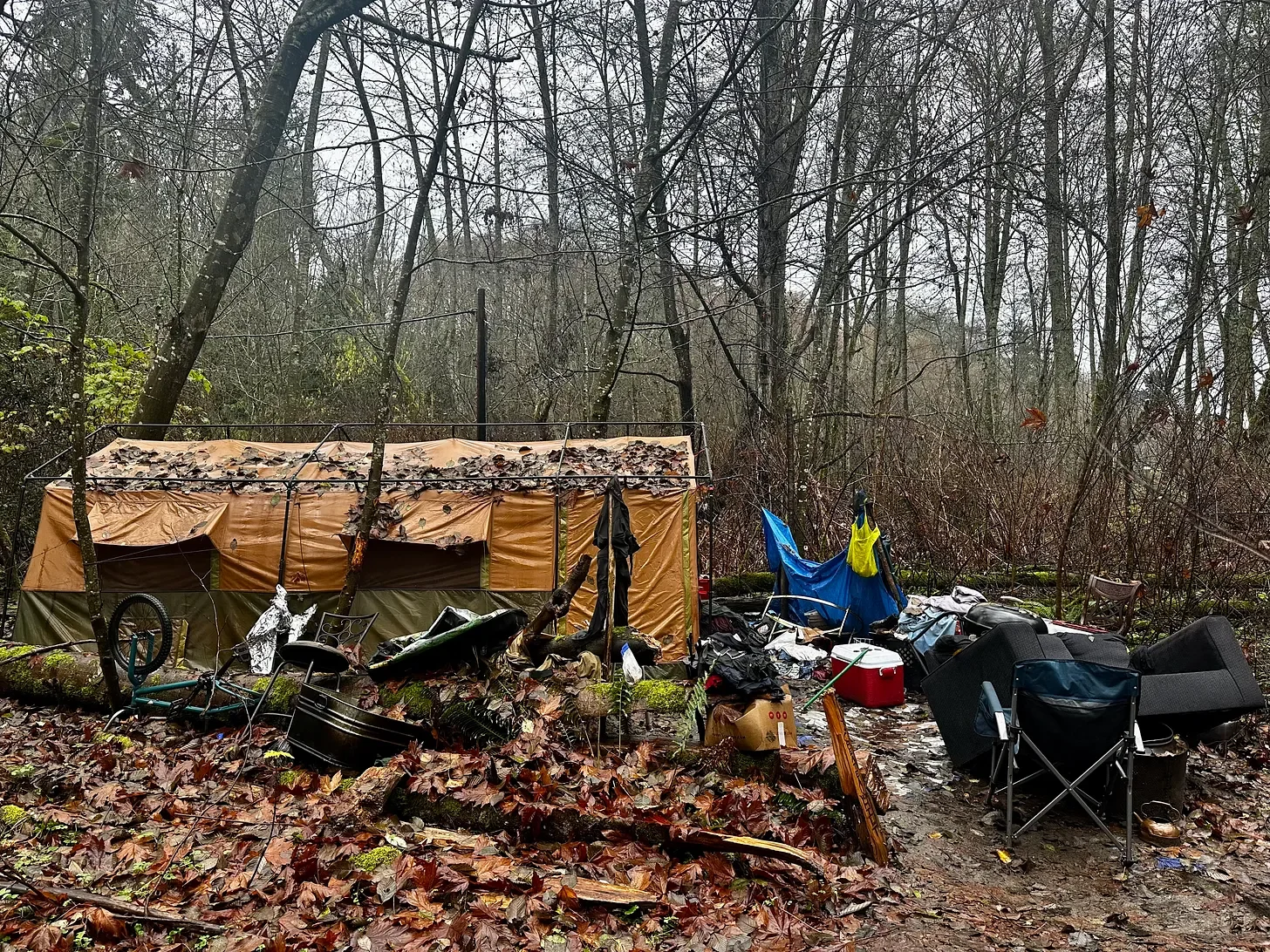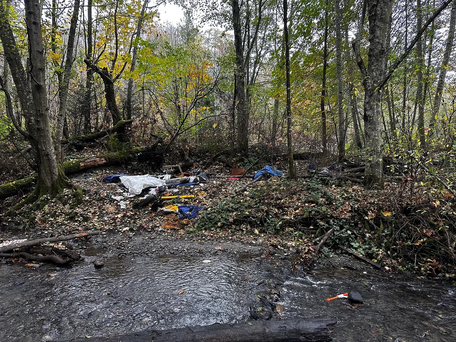 On a piece of Clallam County–owned land just below the 8th Street bridge, a major creekside tent encampment has taken hold.
