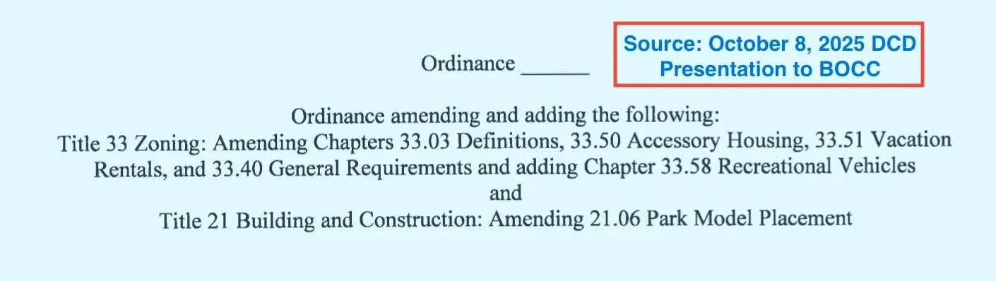 DCD Director Emery and the commissioners have since tried to reframe the 180-day RV limit as an expansion of use, citing what they claim is an existing 90-day occupancy limit in Clallam County Code (CCC) 33.50.020(2). But the line they reference is ambiguous, poorly placed, and effectively unenforceable. It appears to have been quietly added in 2002 by then-commissioners Mike Chapman, Steve Tharinger, and Howard Doherty — and inserted into a section of code intended to regulate Accessory Dwelling Units (ADUs), not recreational vehicles.