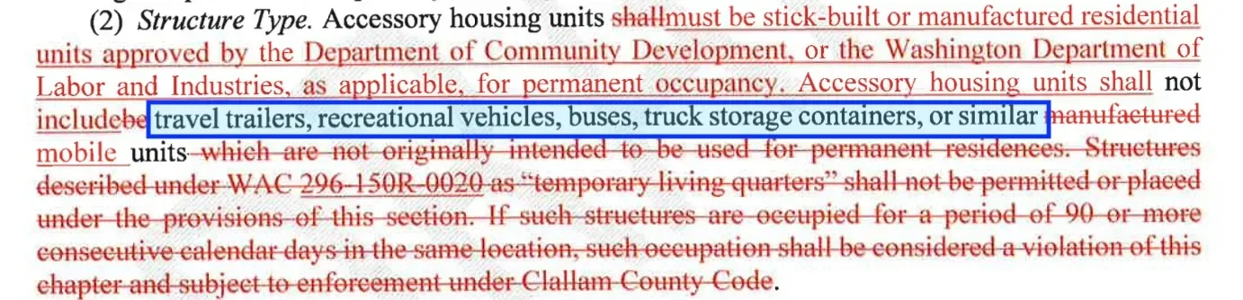 Currently, the line in question sits within the ADU regulation code, as shown below (highlighted in blue). But RVs are not ADUs: they are regulated by Washington State Labor & Industries, do not require a certificate of occupancy, and are explicitly excluded from the “Structure Type” definition required for ADUs.
