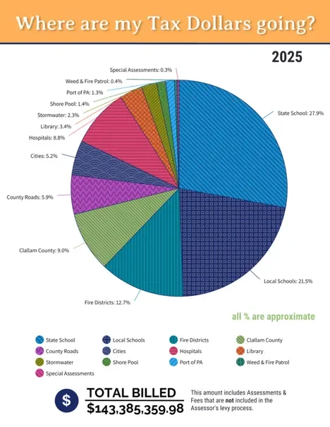 The county’s general fund makes up about 9% of the total property tax burden for Clallam County taxpayers and is used to fund essential government services. These include public safety, health and human services, courts, jails, public defenders, the assessor’s office, planning and permitting, juvenile and family services, and parks and recreation.