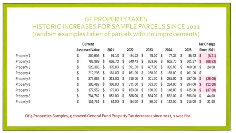 Although the county’s general fund, which accounted for only 9% of total property taxes in 2025, is not the primary culprit, the total property tax burden has soared over the last 5 years. A sampling of homes, including those of the commissioners, showed a 44.8% average increase in total property taxes over five years.